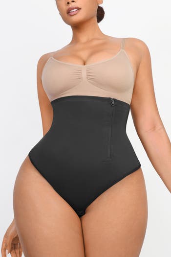 - Convenient side zipper and thong bottom for effortless wear and a seamless look under clothes.