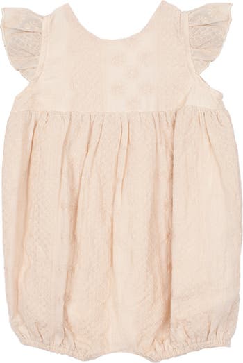 This adorable baby romper comes in a soft beige hue and is made from a breathable fabric, ensuring comfort for your little one. The romper features charming flutter sleeves and delicate pleating for a touch of elegance. Elasticized leg openings provide a snug fit. easy and convenient.
