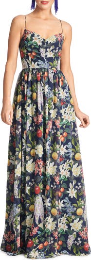 Fruits and flowers bring luscious charm to a frothy chiffon gown hung from the slimmest straps.