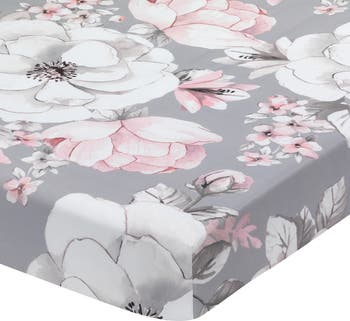 This exquisite 100% cotton fitted crib sheet has a gray ground with blossoming pink and white watercolor flowers. It is breathable cotton and has elastic all the way around ensuring a safe and secure fit on a standard sized crib mattress measuring 52” X 28”.