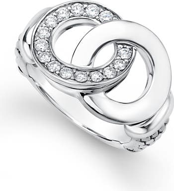 Pavé diamonds pair perfectly with the polished sterling silver that shapes this signature Caviar interlocking ring.