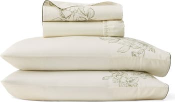 Piped edges and floral designs enhance the elegance of a premium sheet set woven from breathable, long-staple organic cotton that gets softer with every wash.