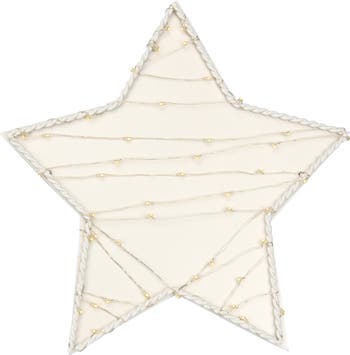This stunning wooden star light up wall décor is painted in a pearlized champagne color. It is wired with opalescent white LED lights and is battery operated for cordless functionality. It comes with a one-hour timer and on/off switch on the side for longer use. Requires 3 AA batteries not included.