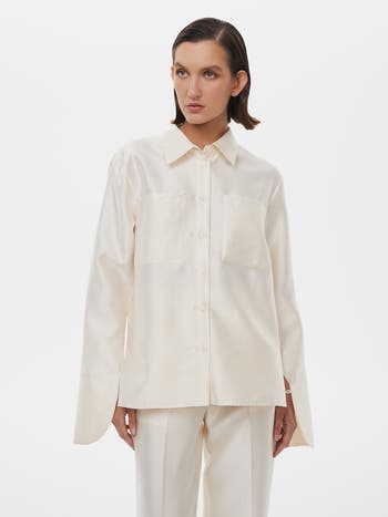 This lightly fitted button-up shirt is crafted from a premium silk-wool blend, offering both softness and structure. It features side slits for ease of movement and long signature cuffs, making it a versatile piece for elevated everyday style.