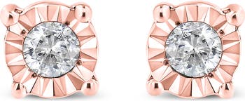 Add a shimmering touch to your look with these polished diamond studs crafted in sterling silver plated with white rhodium or finished with 10K rose or yellow gold electroplating. Each earring features a miracle plated round diamond that creates the appearance of a larger stone and enhances its sparkle for maximum brilliance. The diamonds are J K in color with I3 clarity, so they have visible inclusions that add character while still offering bright, eye catching shine. These classic studs bring effortless style to any outfit and make a versatile addition to your everyday jewelry lineup.