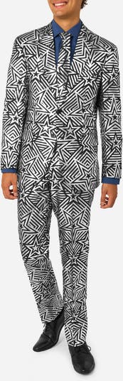 Exploding in silvery geometries, this entrance-making suit keeps you spotlight-ready when the occasion calls for standing out and allows for dressing nice. The jacket features padded shoulders and a traditional tailored silhouette, while the trousers sit comfortably at the waist and stay slim down the legs. The matching tie cinches the smart, coordinated look.