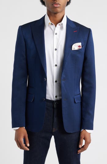This deep navy sport jacket is woven in a refined tonal micro-pattern jacquard for subtle texture and elegant sheen. Fully lined in multicolored silk-like viscose featuring a playful cocktail motif, it s complete with a pull-out matching pocket square. It s tailored with peaked lapels and a two-button closure for a modern, polished fit.