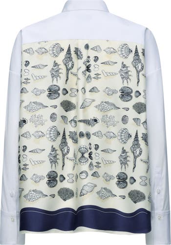The Sirene has a small point collar and classic button front opening. The dropped shoulder line is balanced with slim sleeves which are finished with button cuffs. The body shape is square with an easy relaxed fit. The shirt has a back panel made in silk twill, featuring the CÂLLAS original scarf print of seashells. Made from Italian cotton poplin and silk twill.