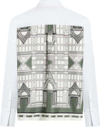 The Sirene shirt is a long sleeve, button front, shirt featuring a glossy silk twill scarf print back