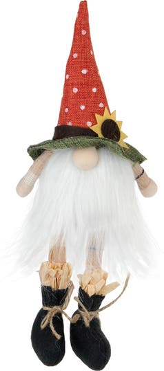 Decorate your mantles and table tops this Fall season, with this adorable sitting sunflower gnome. Featuring a yellow sunflower attached to the orange and green hat, it will blend perfectly with your Thanksgiving decor. Designed with dangling legs, it will add a whimsical touch to your loving home. Product Features: Sitting gnome with dangling legs Wearing an orange hat with white polka dots and a green brim Hat also accented with brown band and a yellow sunflower Wearing black boots accented with straw and jute bow Long white faux fur beard covers the face Bulbous nose under the hat Plaid arms and legs Dimensions: 11"H x 4"W x 3"D Material: polyester/faux fur/jute rope