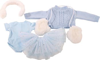 - This ultimate wintery outfit includes tulle skirt with glitter, and matching light blue body suit and sweater. Top it off with plush mittens on a string and plush ear warmers. Please note: doll, tights and ice skates not included.