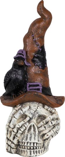 Diversify your spooky décor with this skull in a witch s hat with crow Halloween decoration. This tabletop piece combines chilling details and classic Halloween icons for a striking seasonal display. At its center sits a realistic skull, framed by bony skeleton hands wrapped around the face for a dramatic and unsettling effect. Topping off the design is a tall black witch s hat, accented with a vivid purple buckle for a bold contrast. Resting on the hat is a sinister black crow, completing the gothic look with an ominous touch. Designed with intricate textures and striking contrast, this skull decoration makes an unforgettable addition to any Halloween setup. Its tabletop size makes it versatile enough to display on mantels, shelves, countertops, or as part of a larger haunted centerpiece. Crafted from durable materials, it’s built for repeated use so you can enjoy it season after season. Perfect for haunted houses, Halloween parties, or simply adding a creepy twist to your Halloween décor, the skull Halloween decoration captures the essence of the season in one chilling design. Place it anywhere indoors to transform your space into a frighteningly fun scene guests won’t soon forget. Product Features: Skull with hat Halloween decoration Skull is features 2 skeleton hands around the face Witches hat is accented with a patch, stitches and hat band with buckle Comes with a black crow wearing a purple witches hat Accented with iridescent glitter For indoor use only Dimensions: 22.75"H x 9.5"W x 10.5"D Material(s): ceramic