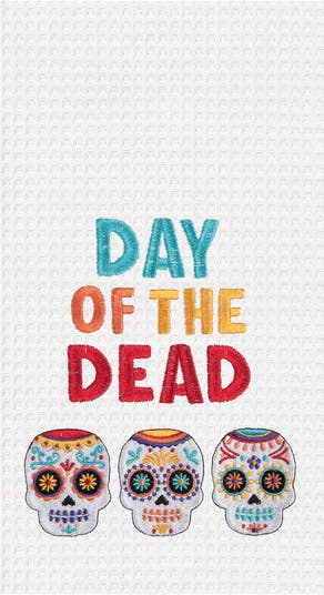 Add a touch of cultural beauty and festive charm to your kitchen with the "Day Of The Dead Skull Trio" Dish Towel. Crafted from high-quality cotton flour sack material, this dish towel is not only durable and highly absorbent but also a stunning representation of the vibrant and colorful traditions of Dia de los Muertos. The focal point of this dish towel is the trio of intricately embroidered sugar skulls, each adorned with elaborate designs and bright colors that symbolize remembrance and celebration. These traditional sugar skulls pay homage to the rich cultural heritage of the Day of the Dead holiday, capturing the essence of honoring lost loved ones with joy and vibrant colors. Whether you re a fan of Halloween festivities, a lover of cultural traditions, or simply looking to add a unique and meaningful touch to your kitchen decor, the "Day Of The Dead Skull Trio" Dish Towel is a perfect choice. Display it on your oven handle, hang it on a towel rack, or use it for drying dishes to infuse your kitchen with the spirit of Dia de los Muertos and the beauty of Mexican folk art.