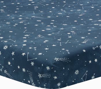 This constellation design breathable 100% cotton fitted crib sheet is on a navy-blue ground. There are hundreds of white stars in different shapes and sizes. This fitted crib sheet has elastic all the way around ensuring a safe and secure fit on a standard size crib/toddler mattress measuring 28” X 52”. This gender-neutral design works well for baby boys and baby girls.