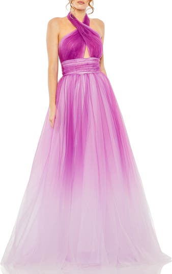 Cross-front ombre gown, blending vibrant hues for a stunning, eye-catching design with a flattering silhouette.