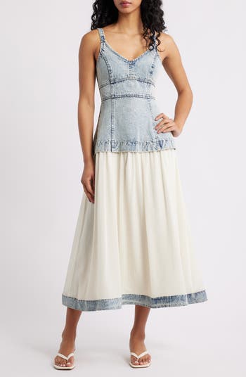 Achieve a two-piece look with casual one-and-done ease in a denim dress that reads like a fitted vest paired with a flowy skirt.