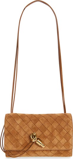 This suede wallet on a strap in the label s handcrafted intrecciato weave features a tethered pin that secures the flap and metallic-knot hardware—a signature of the Andiamo line.
