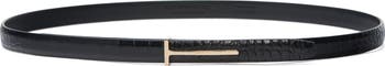 Horizontal T hardware sleekly authenticates a slender belt fashioned in Italy from croc-embossed goatskin.