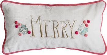 Add a festive touch to any space with this slub lumbar pillow, featuring intricate hand embroidery, playful pom poms, and elegant piping. Measuring 18 inches in length and 9 inches in width, this pillow enhances holiday cheer in any setting. The luxurious velvet back showcases the cheerful message "Merry" in a vibrant multicolor palette, making it a perfect addition to winter and Christmas decor. Crafted from durable cotton for the cover and filled with polyester for lasting comfort, this pillow is ideal for decorating sofas, chairs, or beds, bringing a delightful holiday spirit to every home.