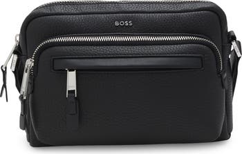A debossed logo makes a signature statement on a scaled-down messenger bag crafted from grainy leather and suspended from an adjustable strap for style and functionality.