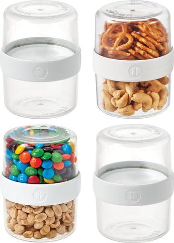- DUAL-LOCKING CAP - Designed to keep your favorite snacks fresher for longer, the iDesign Small Stack n Snack Containers make on-the-go snacking even easier; The innovative dual-locking silicone cap rests in the middle and seals in freshness to the top and bottom container; This leakproof design prevents unwanted spills and stores a variety of foods for convenience and versatility; Set of 4
