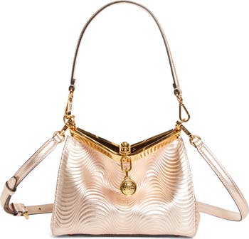 Though small in size, this Vela bag makes a major impact with wave-debossed metallic calfskin and gleaming hardware, including a coin-minted Pegaso medallion.