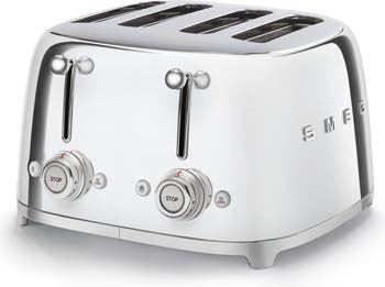 Retro design meets modern functionality in a powder-coated steel toaster featuring four extra-wide, extra-long slots with self-centering racks, automatic slice pop-up and a removable stainless-steel crumb tray. Bagel, reheat and defrost functions ensure your toasted treats are perfectly browned every time.