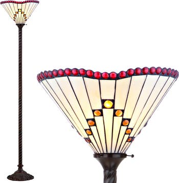 One of the finest techniques to come out of the Art Nouveau movement, the Tiffany-style stained glass shade on this torchiere floor lamp makes for a stunning addition to any space. While steeped in traditional design with it s barley-twist base and tri-color deco motif on the shade, this piece is updated with the functionality expected today -- a step-on on/off button, LED bulb compatibility, and a beautiful silk-wrapped cord. Each shade is hand-made by artisans who specialize in the intricate art of stained glass soldering.