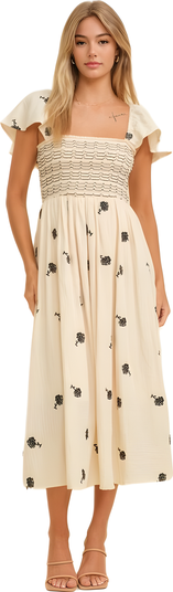 Embrace effortless elegance with this Knit Lounge cream midi dress. Featuring a smocked bodice for a flattering fit and flutter sleeves for a touch of romance, this dress is adorned with subtle black floral accents for a charming contrast. Perfect for both daytime outings and evening gatherings, it offers an easy yet refined look.
