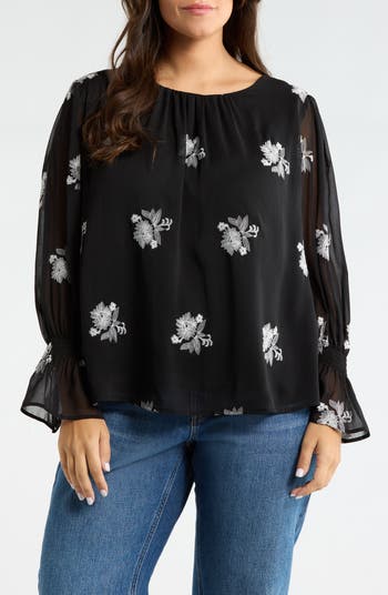 Bouquets of smocked blooms romance this airy chiffon top that s ideal from day to night.