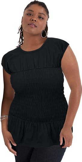 This fitted, sleeveless knit top features a wide shoulder design, a crew neck, and a peplum hem with front and back smocking panels for added texture. It’s adjustable fit makes it super comfortable.