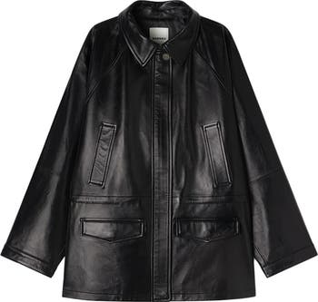 Loose-fit jacket in plain, smooth leather with a shirt collar, long raglan sleeves and a zip fastening under a covered placket.