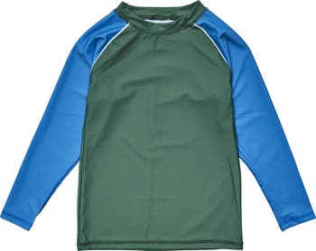 They can sport classic surf style in this raglan-sleeve rashguard top with quick-drying fabric, built-in sun protection and a standout colorblocked design.