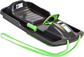 - Sophisticated steering and runner system for pure sledding fun for all experience levels / Metal brakes with clamps for exceptional braking / Excellent design properties for all types of snow sledding / Convenient tow handle for easy transporting / Ergonomically shaped shell body and footrests / Made of high-quality, cold and fade resistant resin material / Made in Germany