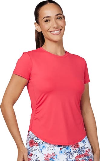 The Sofibella Wild Flowers Short Sleeve Women s Tennis Shirt blends style and functionality, featuring a vibrant floral design that brings a touch of elegance to the court. Crafted with moisture-wicking and UV-protection fabric, this shirt keeps you cool, dry, and shielded from the sun during intense matches. Its comfortable fit and stretchy material ensure unrestricted movement, making it perfect for both practice and competitive play.