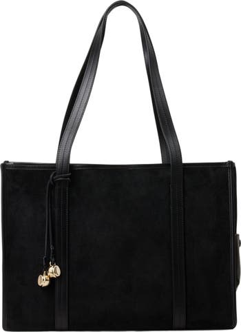 Soft leather tote bag adorned with a charm, with a magnetic leather tab and a side pocket.