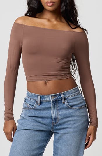 Sleek and minimal, this long-sleeve crop top features a bold, shoulder-baring neckline.