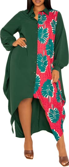Rarely does a shirtdress make a statement, but this imaginatively tailored, vividly colored maxi does just that.