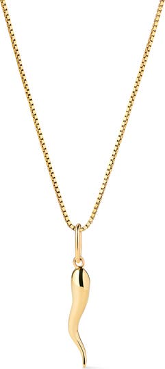 Add a touch of luck to your stack with this solid yellow gold set. This necklace crafted in recycled solid gold features a timeless box chain with a traditional Italian horn charm. Wear this set on its own, add it to an existing stack, or layer on more charms, the styling opportunities are endless. The Italian Horn Charm Necklace includes two pieces: Gold Chain - Gold Mini Box Chain Solid Yellow Gold - Italian Horn Charm.