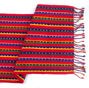 Add cheer to your table setting with the lively colors of the Red Sololá Table Runner. Expertly handcrafted by our artisan partners on a traditional backstrap loom and finished with hand-knotted fringe. This table runner features a bright pattern of colorful stripes accented by black and white jaspe (ikat), typical of textiles from the Sololá region of Guatemala. 100% cotton.