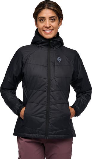 Wind-blocking, water-repelling, heat-trapping, and compressible, the Black Diamond Solution Hoodieis our solution to unpredictable mountain weather. The micro-ripstop material and lofty synthetic fill keep us feeling cozy despite wet and blustery conditions, while the elasticated hood, stretch cuffs, and cinchable hem increase our protection from the elements. Once we make it off the ridge and the sun s rays start to beat us down, this puffy stuffs away inside its own pocket until it s needed again.