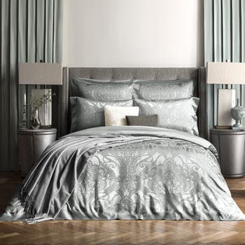- The fine texture of the jacquard fabric and the elegance of the ornament emphasizes the smooth, satin border of pillowcases and duvet cover.