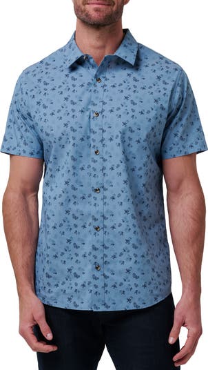 Ocean-blue flowers scatter on the sky-blue fabric of a shirt that s cut from a breathable cotton blend and crafted with a touch of stretch to keep you moving in comfort.