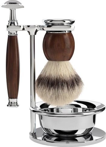 4-part shaving set with bowl, handles of Ironwood with chromed metal accents: Shaving brush with Silvertip Fiber® Shaving brush size L = big shaving brush head with 23 mm ring Safety razor, compatible with classic razor blades Soap dish made of metal, chrome-plated Stand made of metal, chrome-plated The Material - Ironwood Its name speaks for itself: ironwood is one of the hardest woods in the world. Its extremely high density makes it incredibly resistant. Its dark brown colour in combination with the fine grain guarantees its silky and shiny appearance. The Brushhead - Silvertip Fiber® The high-quality synthetic Fibers represent a world first of our own invention. We offer a synthetically produced premium quality whose material characteristics are analogous to those of the precious natural hair, silvertip badger. The majority of the users even say that this quality actually provides better performance characteristics than the natural hair. Silvertip Fiber® is very soft at its fine tips, but somewhat more stable than natural hair in the middle section. These characteristics produce a pleasant, soft sensation on the skin when the lather is applied, without having to forgo the desired firmness of the hairs in the lathering process. In daily use, the manually processed Fibers are less sensitive than natural hair as they dry more quickly and are resistant to shaving soaps and creams. The completely vegan Fibers are also somewhat easier to use than natural hair as they produce a particularly creamy and thick lather from a small amount of shaving soap or cream, which is used much more sparingly as a result. The Razorhead - Classic razor blade For generations, the safety razor has been regarded as a stylish classic which can even shave edges with precision. For many, it is the razor par excellence. Its styling is ideally suited to the design of the MÜHLE products. Even if the open blade does demand a little respect at first: After a brief familiarisation period, and guided by a steady hand, it produces a very close shave and a lasting result. Unlike modern blade systems, the head of the safety razor does not move. The blades are replaced by unscrewing the cap. They can be purchased from us and by retailers everywhere. Measures: Dimensions: 120 mm x 160 mm Weight: 568g