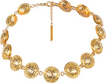 Indulge in a celebration of elegance with the Soulection Necklace, where exquisite craftsmanship meets contemporary design. Handcrafted with meticulous attention to detail, this luxurious piece features a stunning arrangement of layered textured disks and bold chain links, radiating sophistication. The gold-toned disks are adorned with swirling motifs that create a captivating dance of light, enhanced by the luminous sheen of 24-karat gold electroplating. This exquisite necklace is more than an accessory; it is a statement of your unique style and grace. Measuring an adjustable length of 16-18 inches, it ensures a perfect fit for any occasion. The secure lobster clasp, elegant gold chain tassel, and customizable extender chain provide versatility and comfort. Whether you re elevating your look for a special event or adding a touch of glamour to your everyday attire, this necklace harmoniously balances timeless allure with modern charm. Pair it effortlessly with the matching Soulection Bracelet for a complete ensemble that embodies confidence and sophistication.