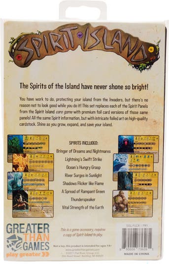 The Spirits of the Island have never shone so bright! You have work to do, protecting your island from Invaders, but there’s no reason not to look good while you do it! This set of Spirit Panels replaces each of the Spirit Panels from the board game Spirit Island with premium foil card versions of those same panels! All the same Spirit information, but with intricate foiled art on high-quality cardstock. Shine as you grow, expand, and save your island. The Spirits Lightning s Swift Strike, River Surges in Sunlight, Vital Strength of the Earth, Shadows Flicker Like Flame, Thunderspeaker, A Spread Of Rampant Green, Ocean s Hungry Grasp, and Bringer of Dreams and Nightmares are included in this pack. This product is an accessory for the board game Spirit Island and requires the board game Spirit Island to play.