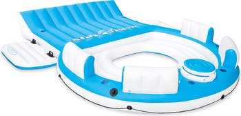 56299EP Intex Relaxation Island - The huge inflated size of 145" x 125" x 20" is big enough for multiple people to enjoy their time on the water. Grab your friends and hop aboard for a great day out on the lake. Includes six cup holders and a built-in cooler to keep drinks on hand for everyone. The 4 oversized backrests make floating extra comfortable. Chill out in style. The item comes with 2 boston valves, 4 handles. 6 built-in cup holders. The Island float comes with a rope to tie off for safety. It also comes with an Anchor bag. 18.2ga. built-in cooler.