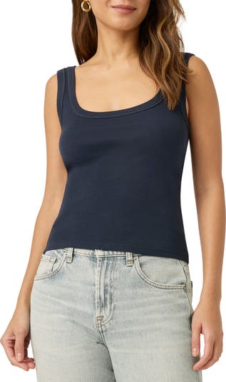 Season-to-season versatility defines a soft cotton-blend tank made for a trim fit and finished with a graceful scoop neck.