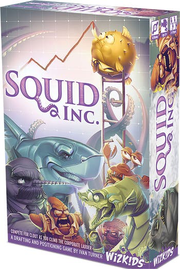 In Squid Inc, designed by Ivan Turner, and featuring art by Matijos Gebreselassie, you play a lowly guppy looking to become the company s big fish by influencing employees at entry level, and guiding them up the corporate ladder, no matter who ends up in your wake! Each round you select a potential employee, with a name, special ability, and a clout score. You can use their clout to place your employees, and power up their ruthless abilities, or you can add the employee to your team. Once your employee makes it into the company, you ll use your team s abilities to earn promotions for each other, floating up the ladder as you demote ore even dismiss your opponents employees . At the end of the game, you ll get points for the combined clout of your employees in the company, with multipliers the higher they ve gotten on the ladder: x1, x3, x5 and even x7 for the top job! But be careful, as once an employee on your team gets there, there will be a world of sharks, octopuses, blowfish, crabs and more, all hungry for your downfall. Will you end up chum in the water, or do you have what it takes to become king of the ocean s largest corporation.