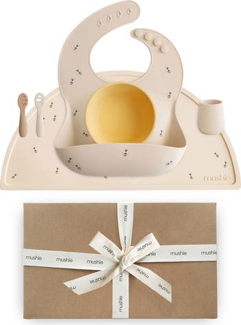 - Includes placemat, bib, 2 first feeding spoons, suction bowl and starter cup